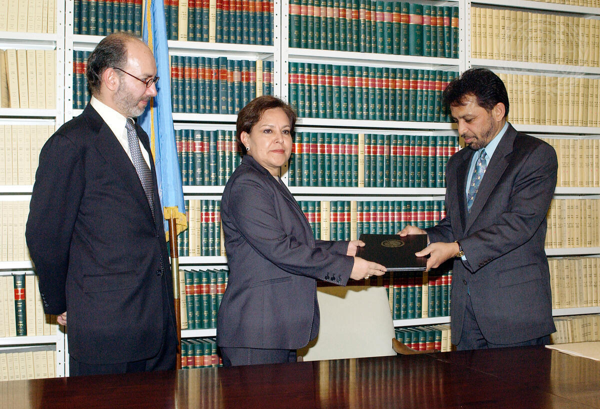 Patricia Olamendi (centre), Under-Secretary for Foreign Affairs of Mexico, deposits the instruments of ratification on: United Nations Convention Against Transnational Organized Crime; Protocol to Prevent, Suppress and Punish Trafficking in Persons, Especially Women and Children; Protocol Against the Smuggling of Migrants by Land, Sea and Air to Palitha T.B. Kohona, Chief, Treaty Section.