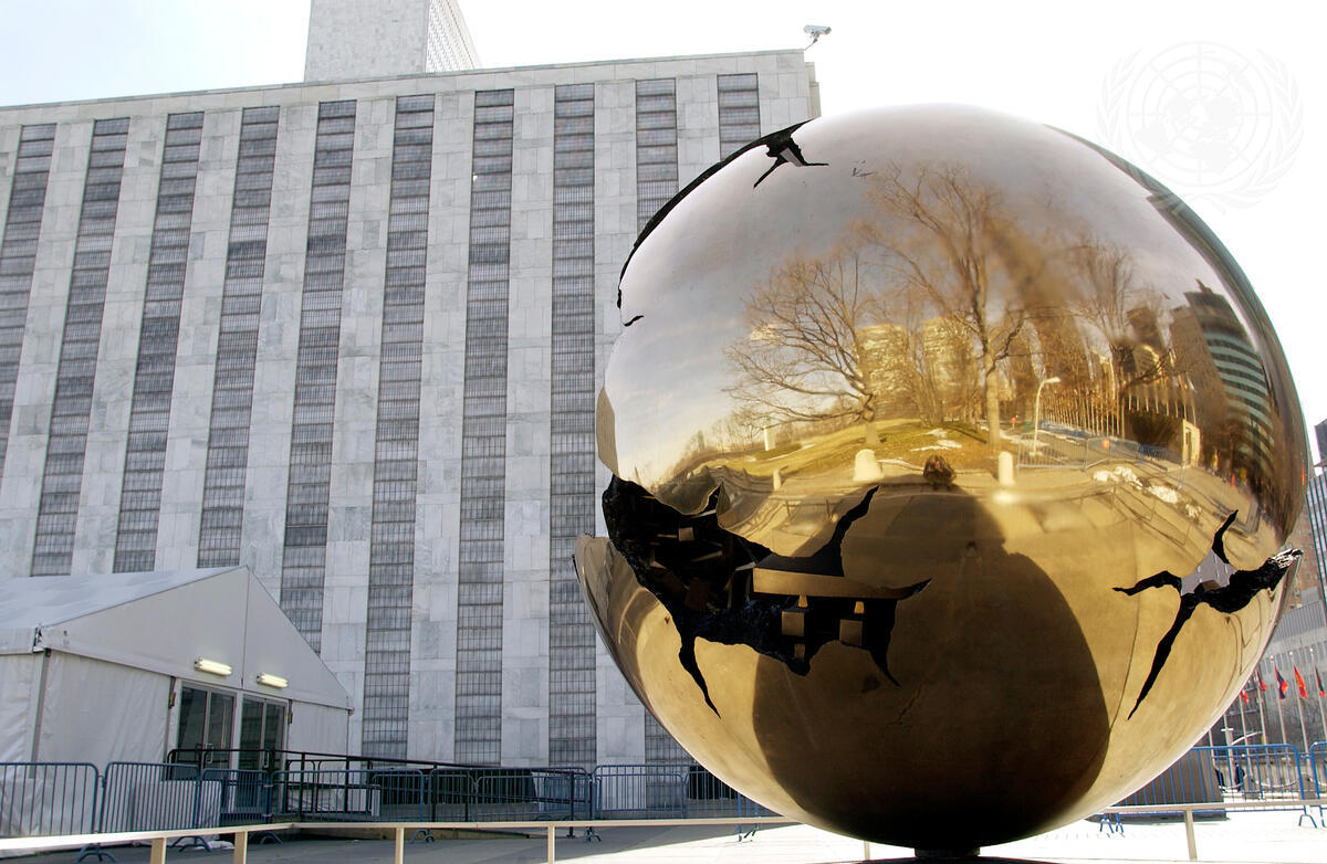 A view of the sculpture entitled ""Sphere within a Sphere"", by Italian artist Arnaldo Pomodoro, at the plaza outside the General Assembly Hall at UN Headquarters.