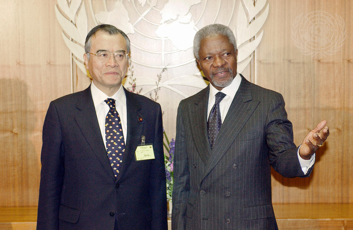 Secretary-General Kofi Annan (right) meets with Takenori Kenzaki, Chief Representative of the New Komeito Party of Japan.