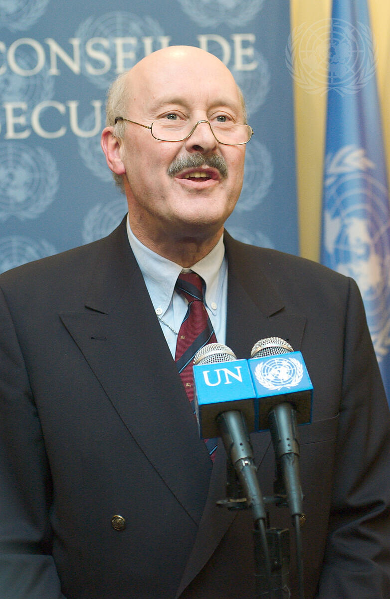 Gunter Pleuger, Permanent Representative of Germany to the United Nations, briefs reporters outside the Security Council on the situation in Iraq.