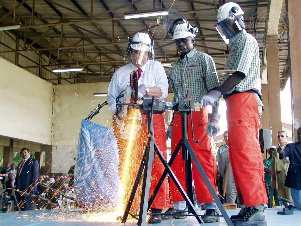 Jacques Paul Klein (left), Special Representative of the Secretary-General for Liberia, attempts to cut through weapons surrendered by ex-rebels at the ceremonial launch of the DDR programme in Monrovia.