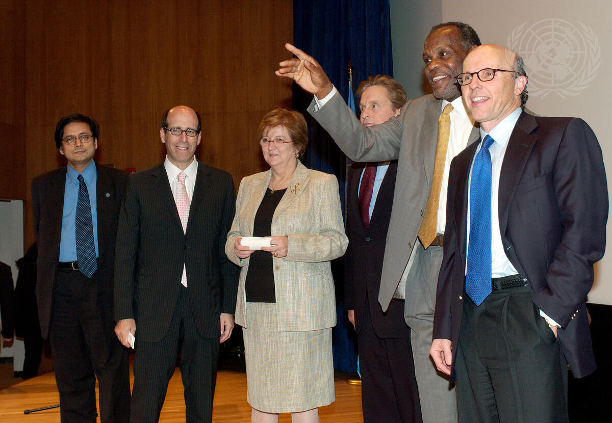 Deputy Secretary-General Louise Fréchette (centre) attends this evening's screening along with Shashi Tharoor (far left), Under-Secretary-General for Communications and Public Information; Michael Douglas (third from right), Actor and UN Messenger of Peace; and Actor Danny Glover (second from right), UNDP Goodwill Ambassador.
