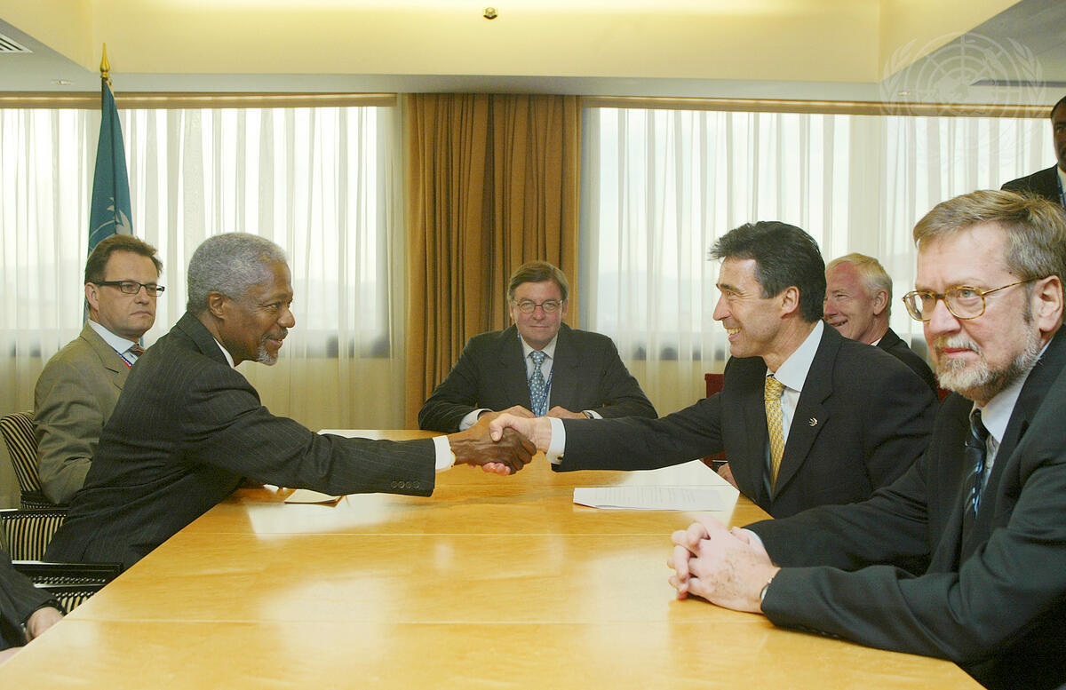 Shown is Secretary-General Kofi Annan (left) shaking hands with Prime Minister Anders Fogh Rasmussen of Denmark, prior to the start of their meeting.