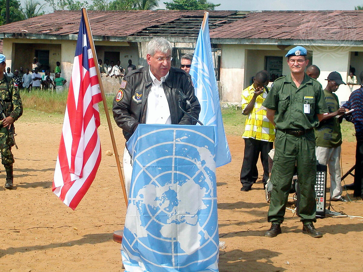 Jacques Paul Klein (left), Special Representative of the Secretary-General for Liberia, speaking during the DDRR programme.