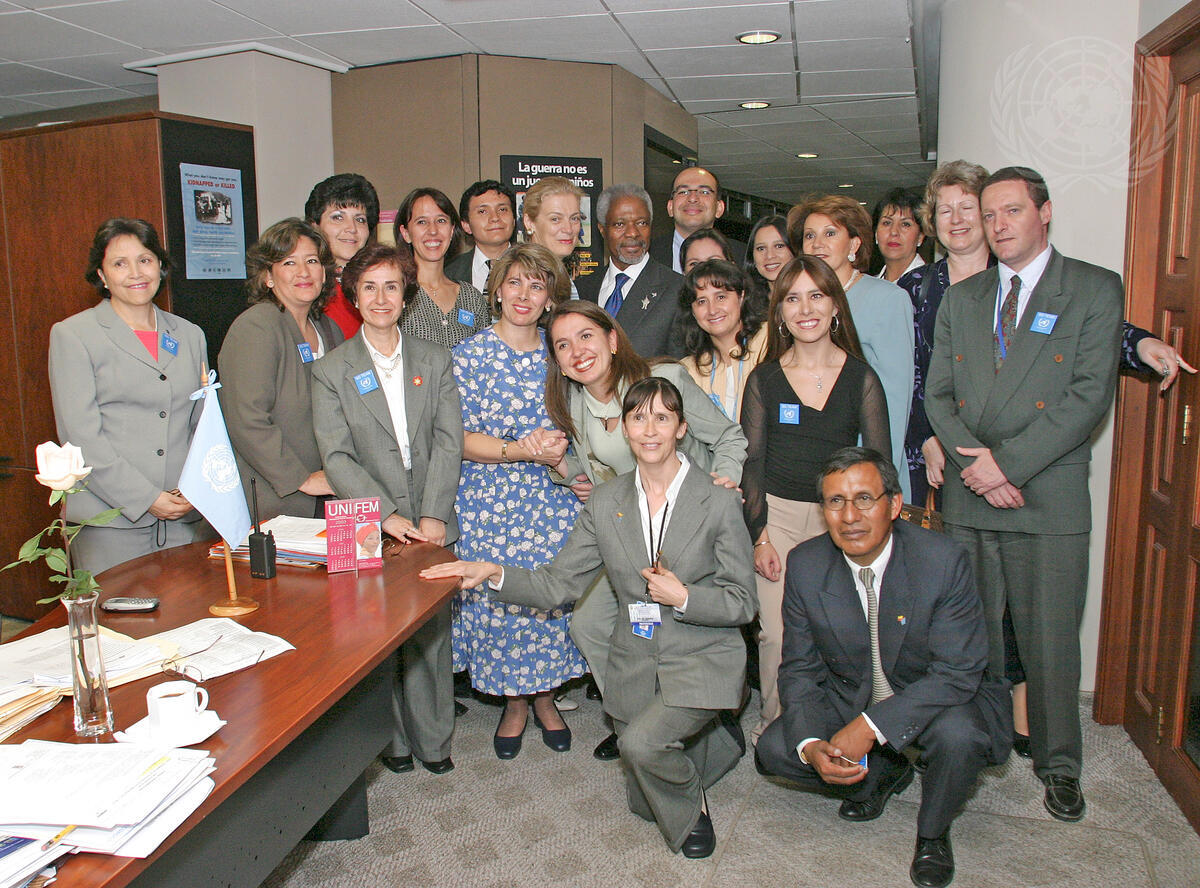 Secretary-General Kofi Annan and Mrs. Nane Annan (centre) meet with United Nations staff in Quito, Ecuador.