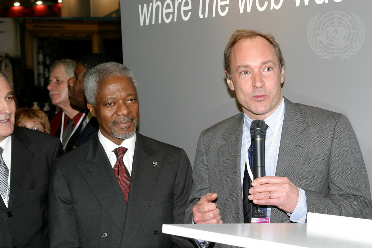 Secretary-General Kofi Annan (left) with Tim Berners-Lee, the investor of the programmes that sparked the World Wide Web.