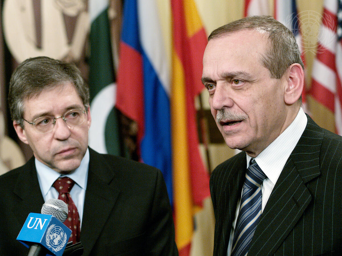 Yasser Abed Rabbo (right), a former Palestinian Cabinet Minister, and Yossi Beilin (left) a former Israel Cabinet Minister, brief correspondents at the Security Council stakeout today. Rabbo and Beilin are the main architects of the alternative peace pact known as the Geneva Accord.