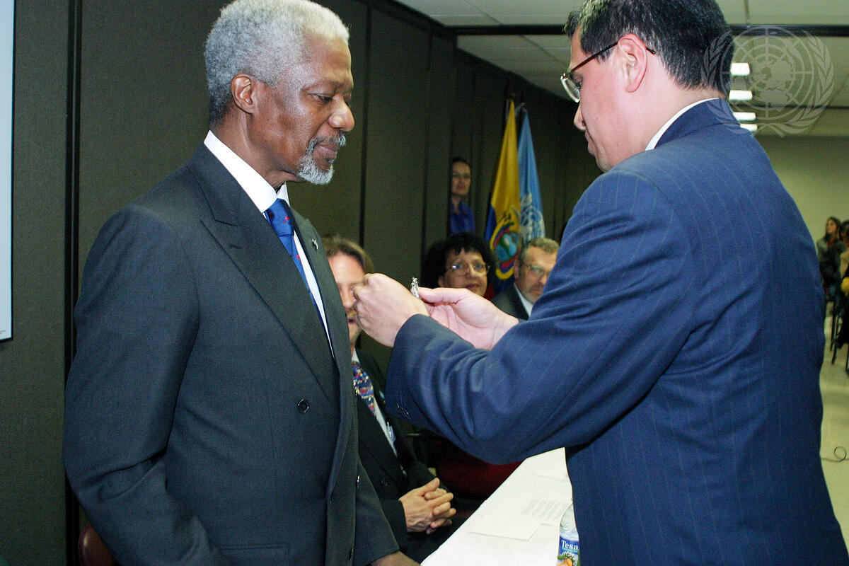 Secretary-General Kofi Annan traveled to Ecuador, on the second leg of his four-country trip to Latin America that includes visits to Chile, Peru and Bolivia. In Quito, the Secretary-General met with Lucio Gutiérrez Borbúa, President of Ecuador. They talked about developments in Ecuador and in the region. The two leaders also discussed the situation of the indigenous people in the country, who represent close to 50 per cent of Ecuador's population, as well as labour rights, environmental issues and human rights.