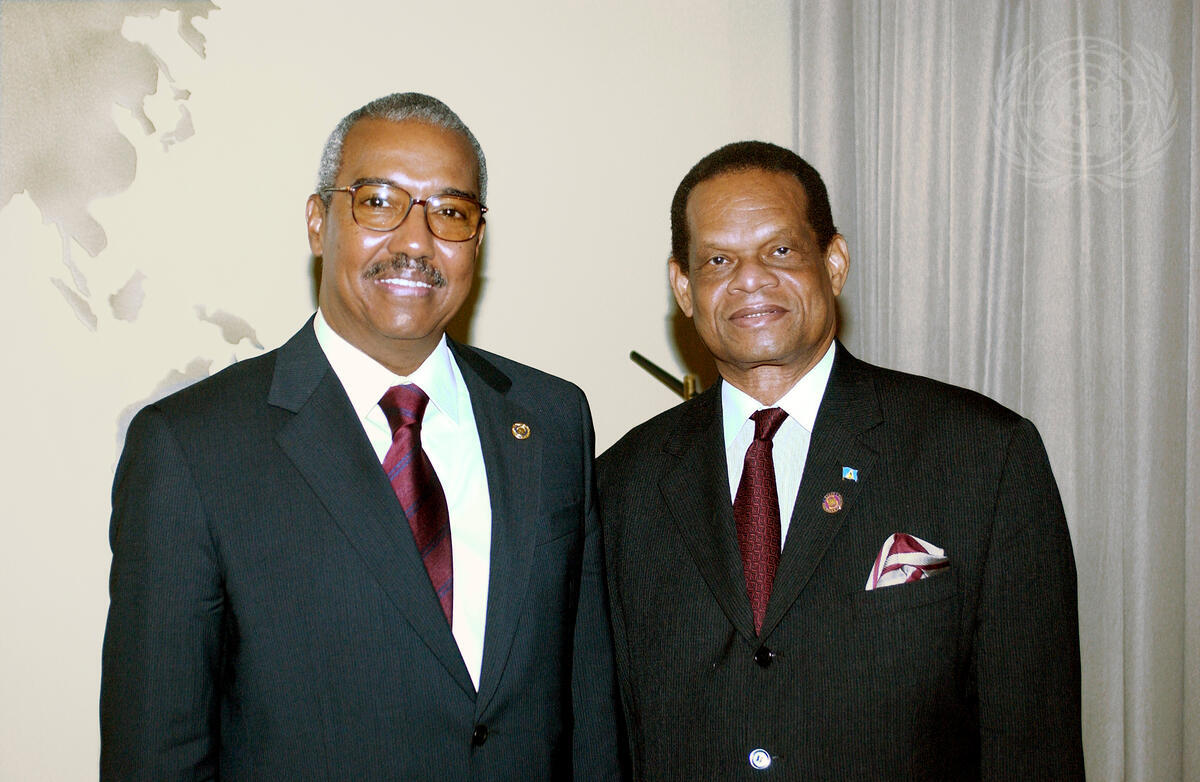 Julian R. Hunte (right), President of the fifty-eighth session of the General Assembly, meets with President Henrique Pereira Rosa, Interim Head of State of the Republic of Guinea- Bissau.