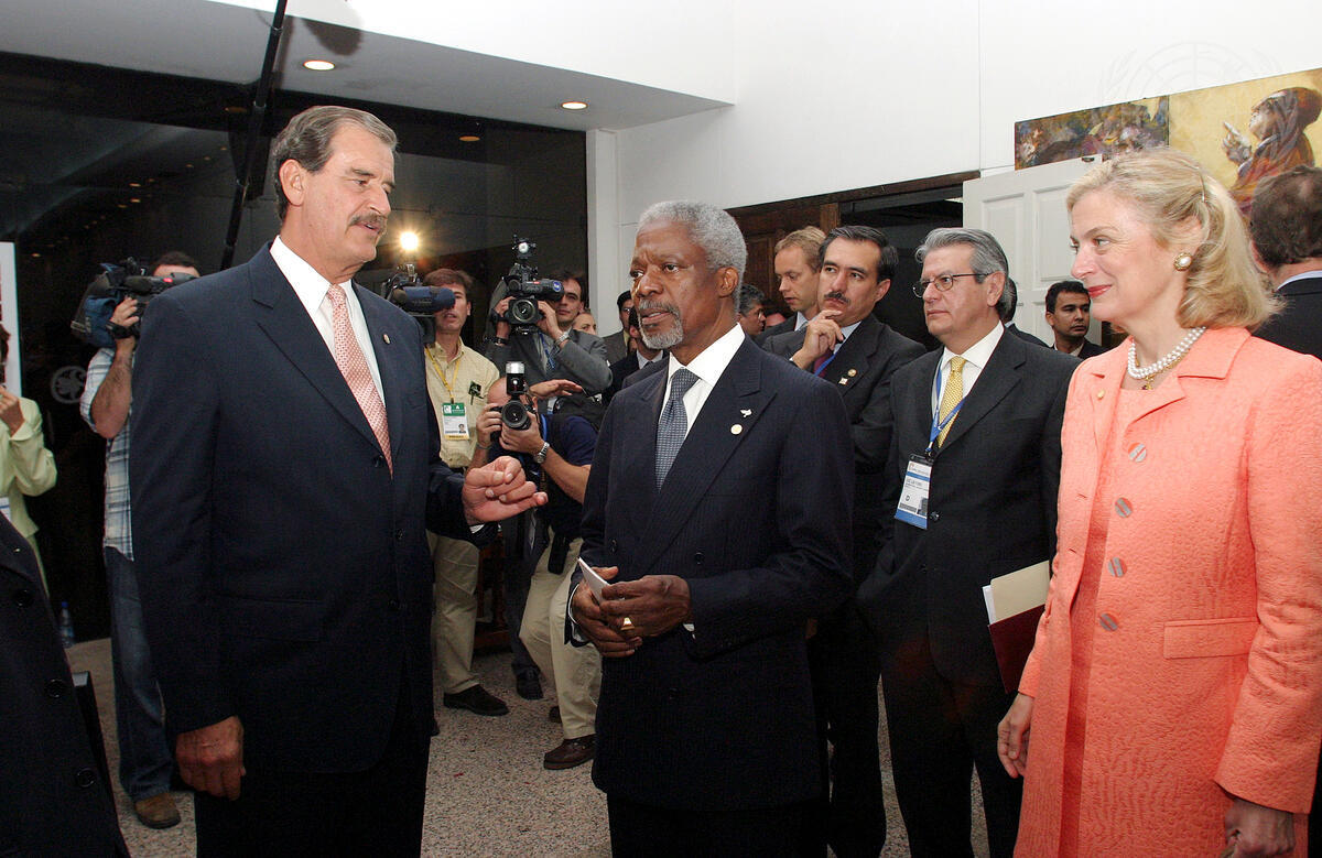 Secretary-General Kofi Annan (centre) meets with Vicente Fox (left), President of Mexico at the Ibero-American Summit. Far right is Mrs. Nane Annan.