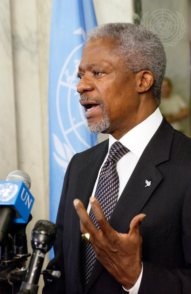 Secretary-General Kofi Annan briefs correspondents upon arrival to United Nations Headquarters this morning.