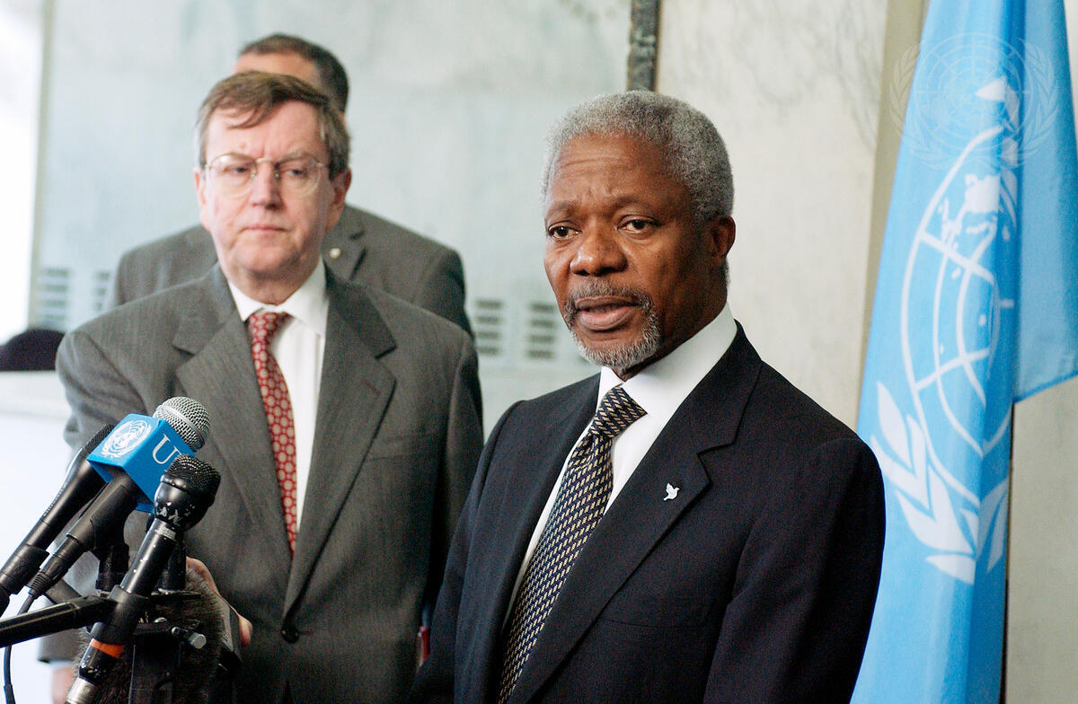 Secretary-General Kofi Annan briefs correspondents upon arrival to United Nations Headquarter this morning. Fred Eckhard, Spokesman for the Secretary-General is at left.