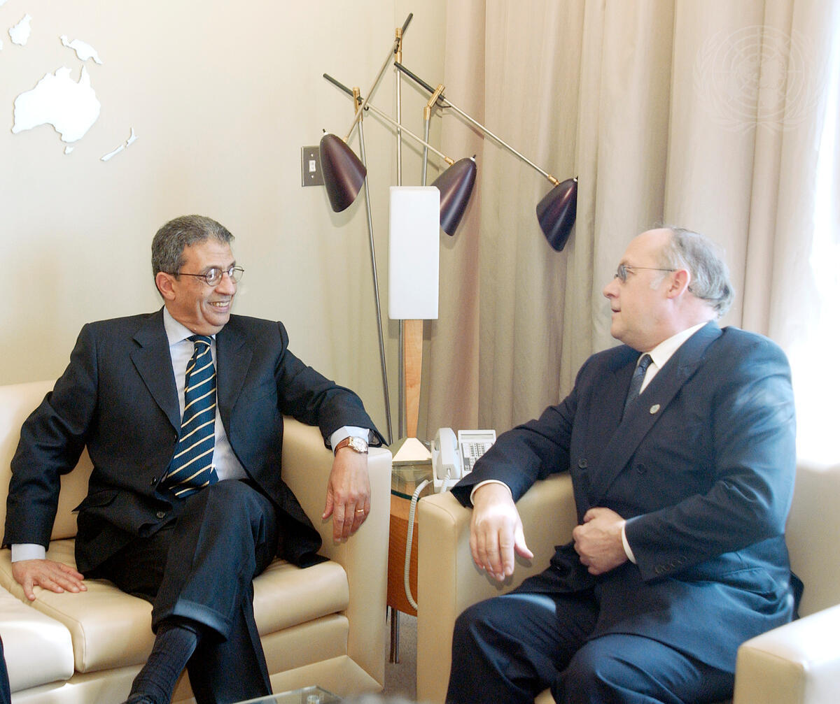 Jan Kavan (right), President of the fifty-seventh session of the General Assembly, meets with Amre Moussa, Secretary-General of the League of Arab States.