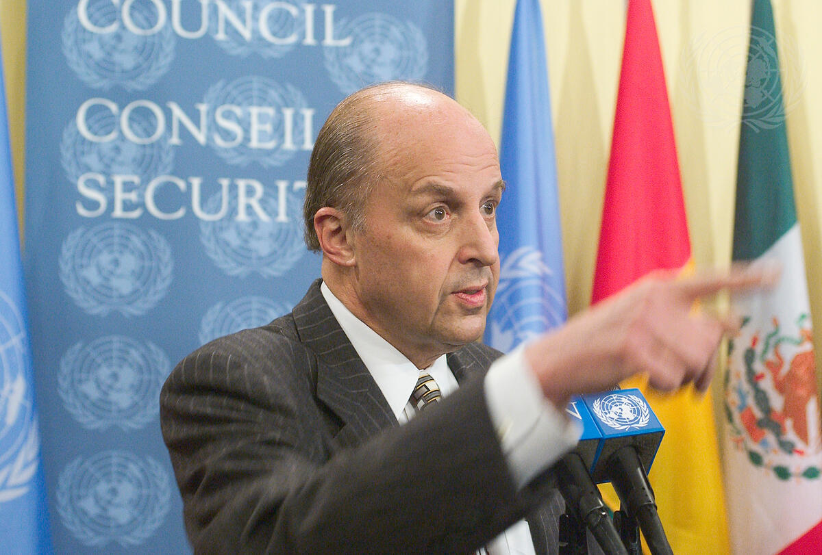 John D. Negroponte, Permanent Representative of the United States of America to the United Nations, briefs reporters outside the Security Council on Iraq.