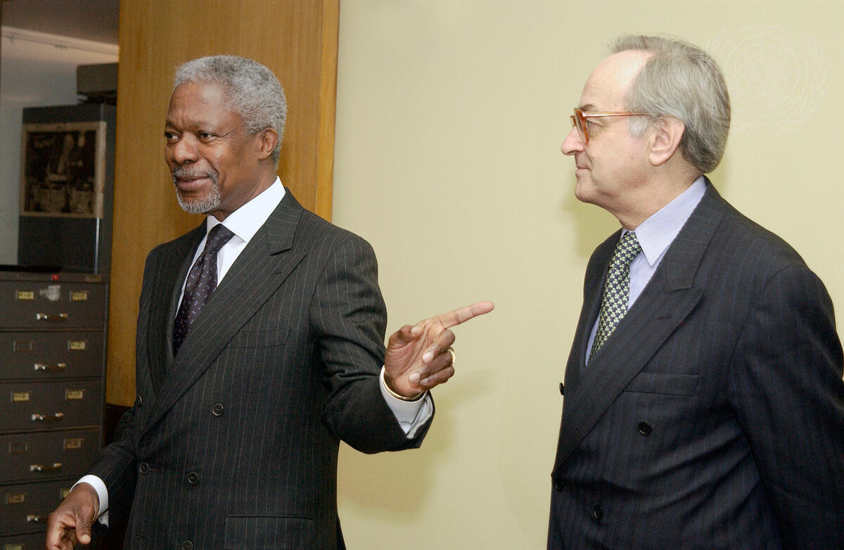 Secretary-General Kofi Annan (left) meeting with Jean-Marc de La Sablière, Permanent Representative of France to the United Nations, prior to the G8 meeting on "Food Aid to Africa".