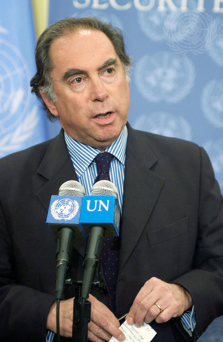 Juan Gabriel Valdes, Permanent Representative of Chile to the United Nations, addresses correspondents at the Security Council stakeout on issues pertaining to Iraq.