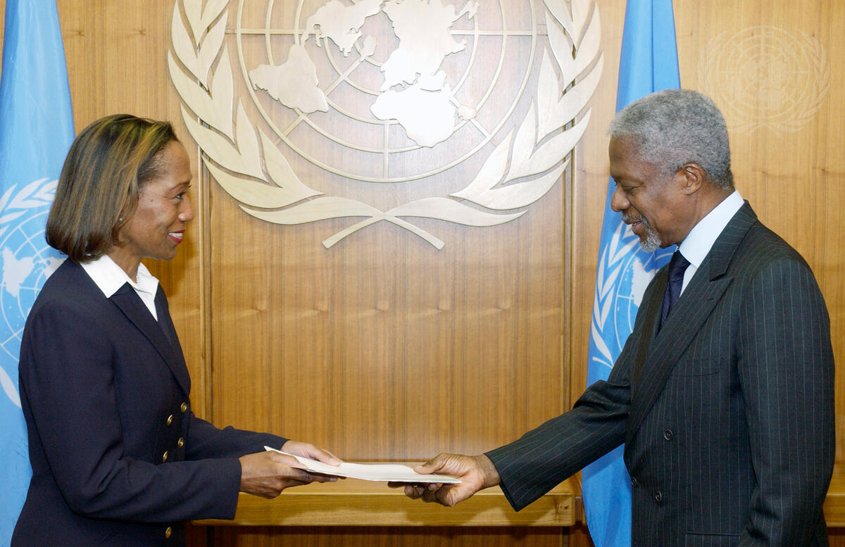Paulette A. Bethel, (left), the new Permanent Representative of the Commonwealth of the Bahamas to the United Nations, presents her credentials to Secretary-General Kofi Annan.