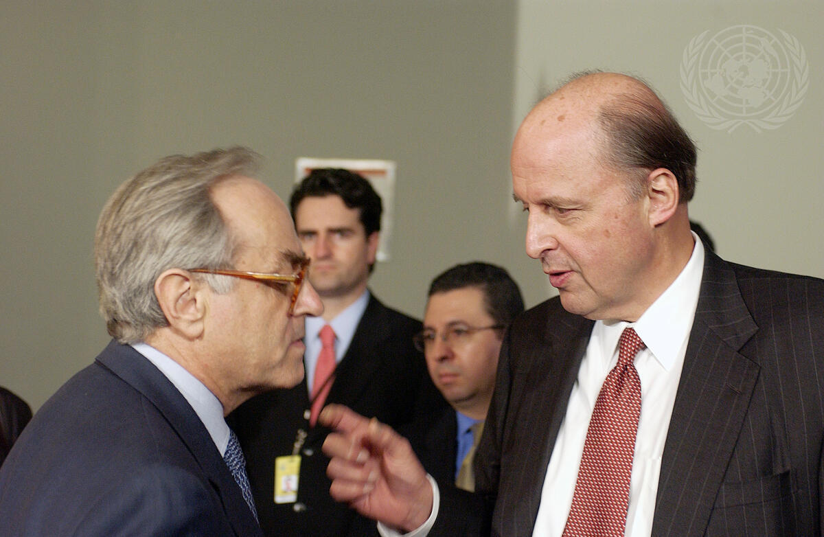 Ambassador John D. Negroponte (right), Permanent Representative of the United States to the United Nations, speaking with Ambassador Jean-Marc de La Sablière, Permanent Representative of France to the United Nations, today outside Security Council chambers.