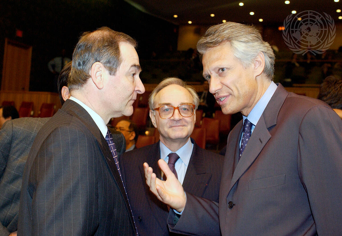 Shown: Jeremy Greenstock (left), Permanent Representative of the United Kingdom of Great Britain and Northern Ireland, listening to Dominique Galouzeau de Villepin (right), Minister for Foreign Affairs of France, in the Security Council today. Centre is Jean-Marc de La Sablière, Permanent Representative of France to the United Nations.