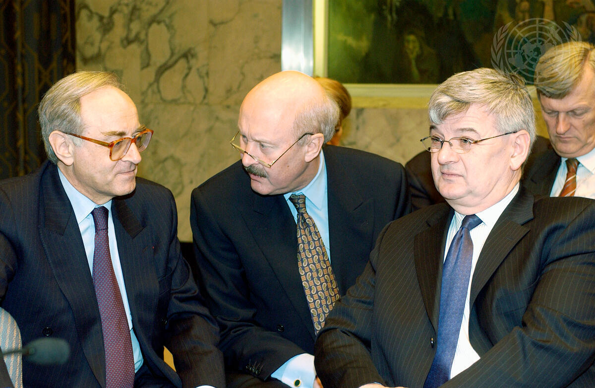 The Security Council met on issues regarding Iraq today. Seen engaged in informal discussions are from left to right: Jean-Marc de La Sablière, Permanent Representative of France to the United Nations; Gunter Pleuger, Permanent Representative of Germany to the United Nations; and Joska Fischer, Minister for Foreign Affairs of Germany.