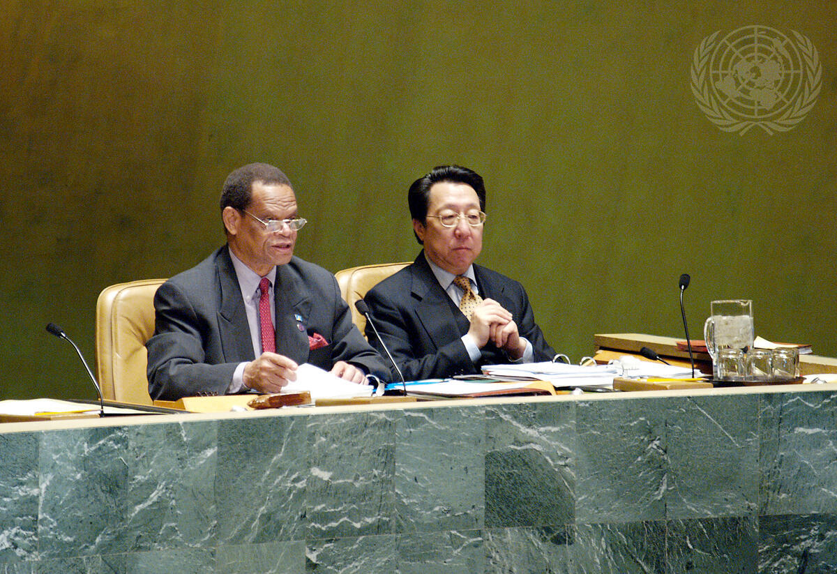 Julian Robert Hunte (left), President of the fifty-eighth session of the General Assembly, addressing at today's meeting. At right is Chen Jian, Under-Secretary-General for General Assembly and Conference Management.