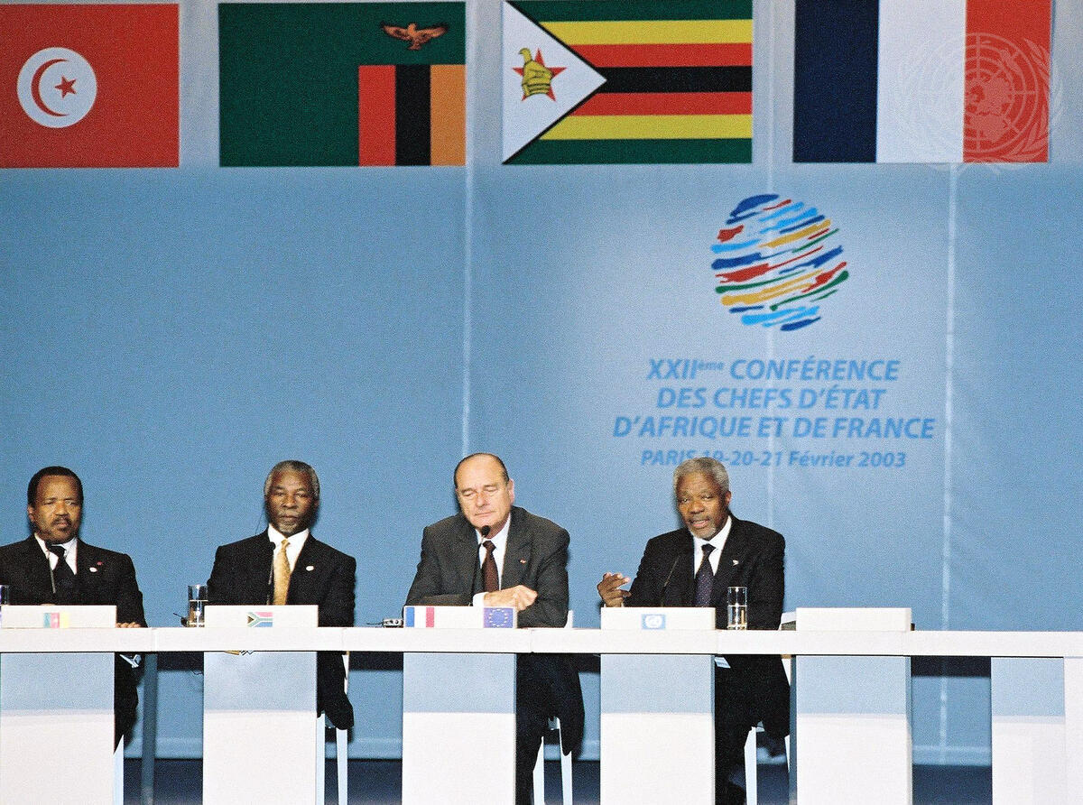 Left to right, President Paul Biya of Cameroon, President Thabo Mbeki of South Africa, President Jacques Chirac of France and Secretary-General Kofi Annan (speaking) at the closing of the Africa-France Summit in Paris.