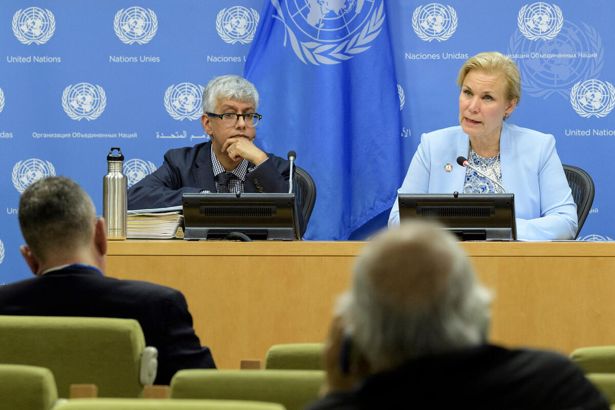 Gunilla Carlsson (right), UNAIDS Executive Director a.i., briefs journalists on the UNAIDS Global AIDS Update and the report on Implementation of the Declaration of Commitment on HIV/AIDS as a guest at the noon briefing. At left is Farhan Haq, Deputy Spokesperson for the Secretary-General.