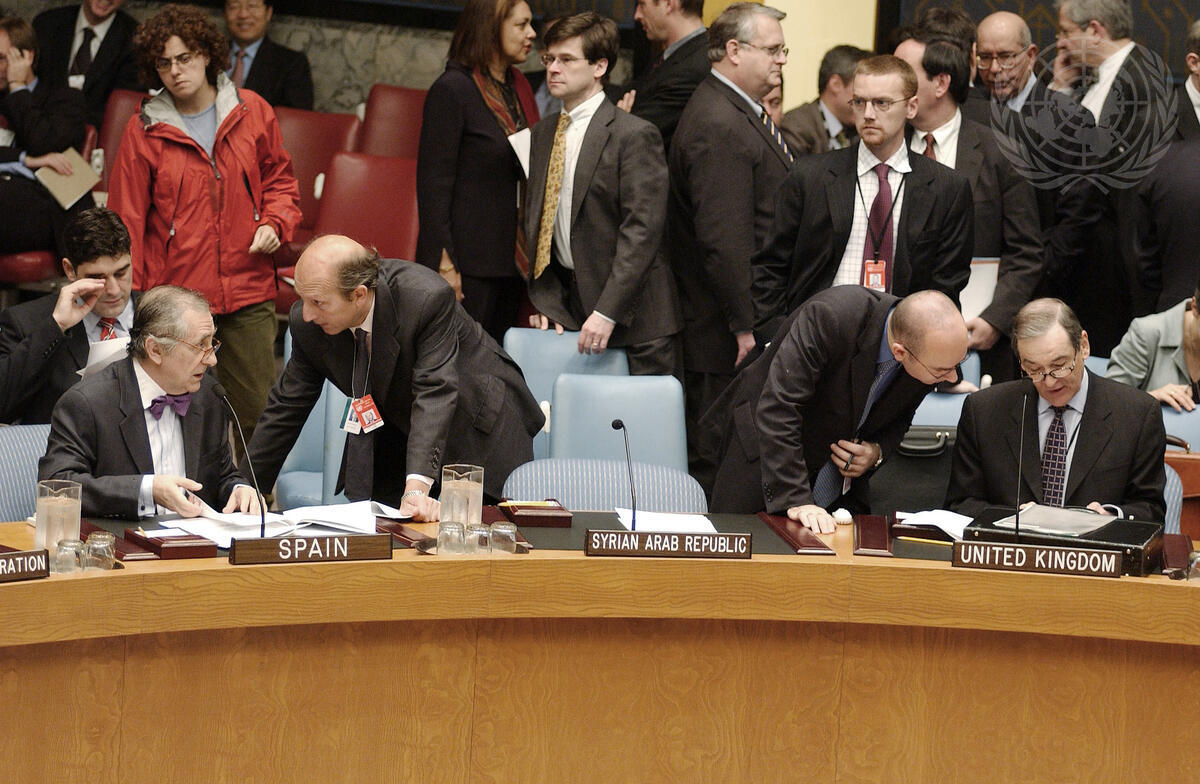 An informal view of Inocencio F. Arias, Permanent Representative of Spain to the United Nations (seated left) and Jeremy Greenstock (seated right), Permanent Representative of the United Kingdom to the United Nations; with a view of the empty seat of the Syrian Arab Republic (centre).