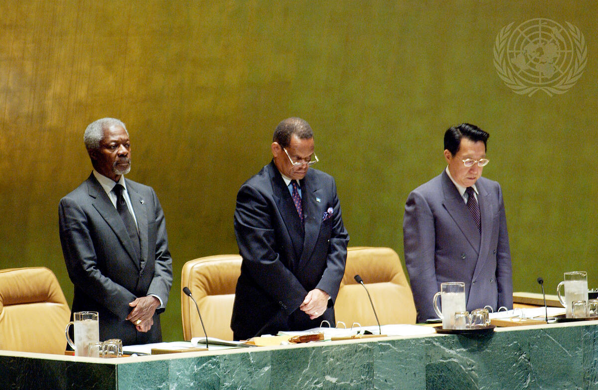 The fifty-eighth session of the General Assembly opened today. During the moment of silence, standing left to right: Secretary-General Kofi Annan; Julian Robert Hunte (St. Lucia), President of the fifty-eighth session of the General Assembly; and Chen Jian, Under-Secretary-General of the Department of General Assembly Affairs and Conference Services.
