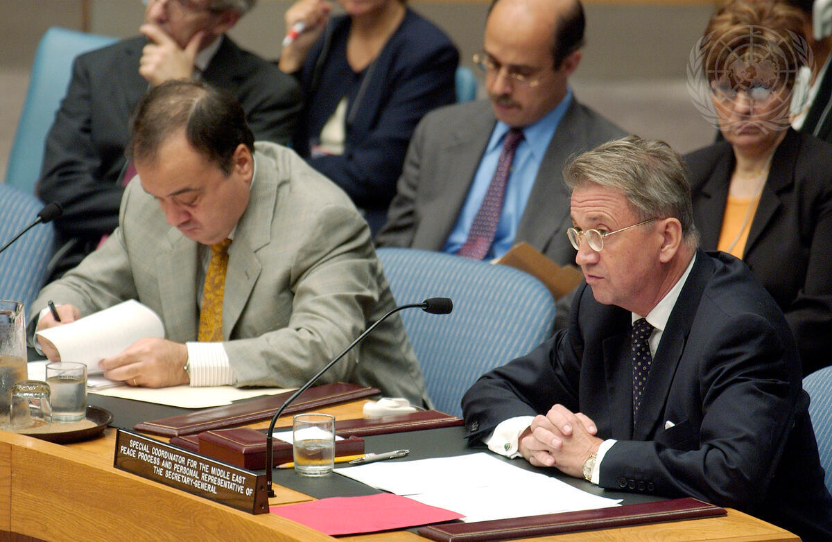 Terje Roed-Larsen (right), United Nations Special Coordinator for the Middle East Peace Process, addresses the Council at today's meeting. Left is Nasser Al-Kidwa, Permanent Observer for Palestine to the United Nations.