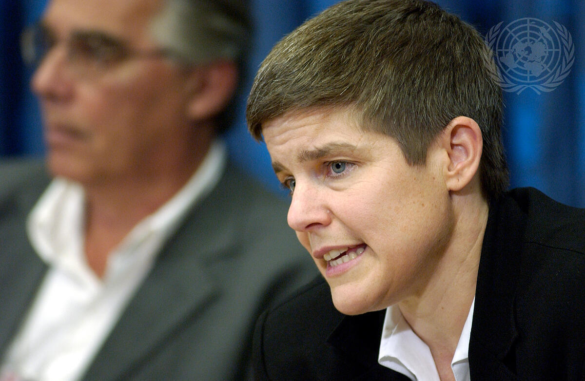 Rebecca Peters, Director of International Action Network on Small Arms, briefs correspondents at today's press conference.