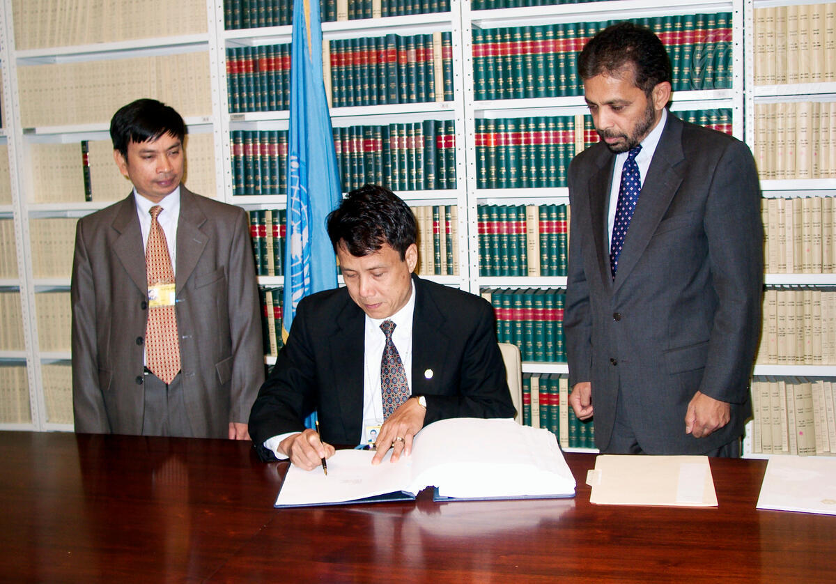 Nguyen Thanh Chau (centre), Permanent Representative of Viet Nam to the United Nations, signs the 'World Health Organization Framework Convention on Tobacco Control'.