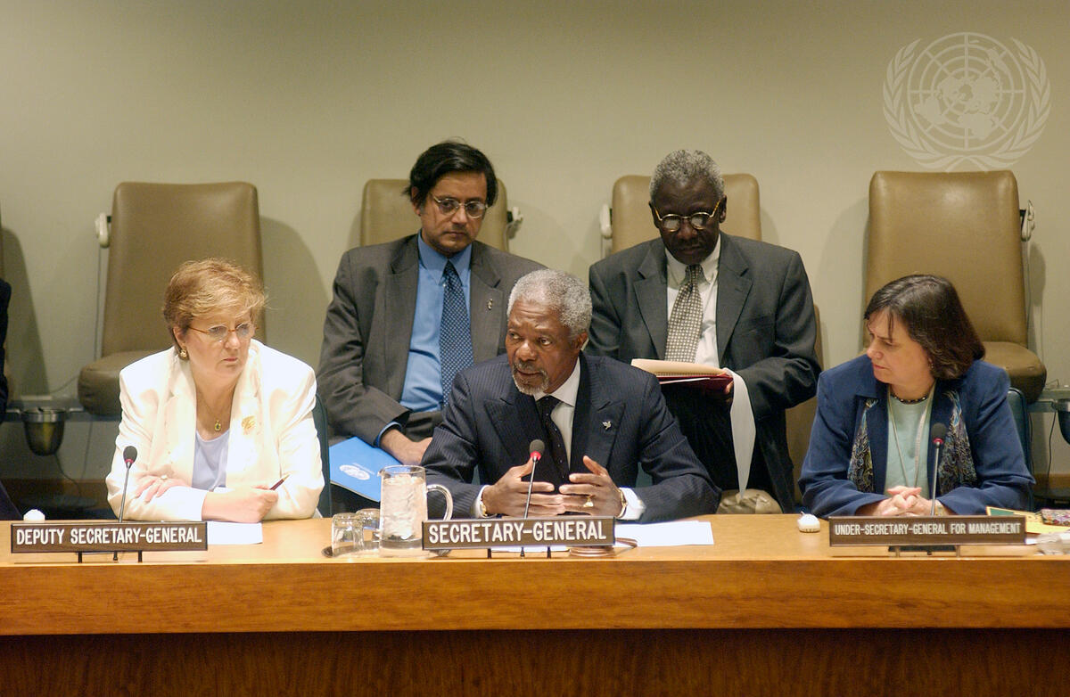 Mr. Annan (centre, front) addressing staff at the video conference. Also attending are Deputy-Secretary-General Louise Fréchette (front, left); Catherine Bertini, Under-Secretary-General for Management (front, right); from left to right behind: Shashi Tharoor, Under-Secretary-General for Communications and Public Information and Lamin Sise, Director of Legal Affairs, Human Rights and Special Assignments in the Executive Office of the Secretary-General.