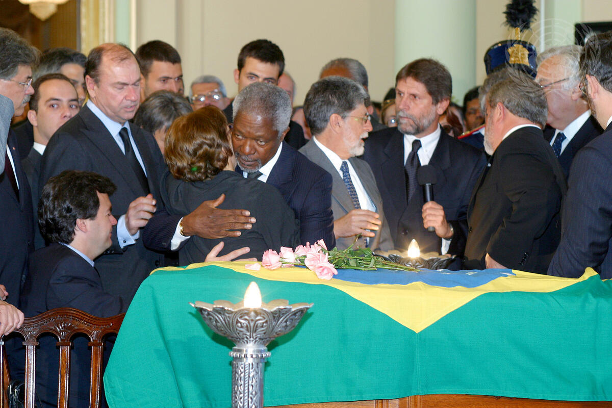 Secretary-General Kofi Annan comforting Ms. Gilda Vieira de Mello, mother of Sergio Vieira de Mello. Right, next to the Secretary-General is Celso Amorim, Minister of Foreign Affairs of Brazil. At right with his back to the camera is Luiz Inácio Lula da Silva, President of Brazil.
