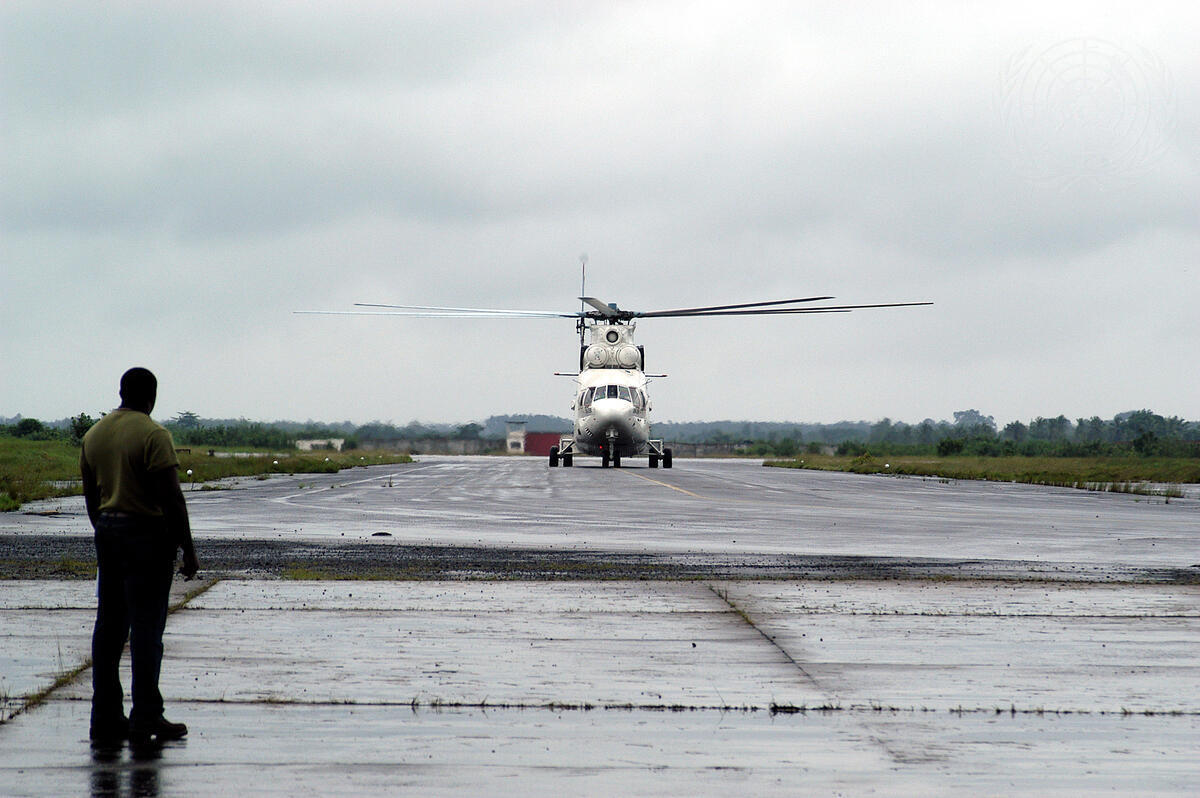 With the support of the UN mission in Sierra Leone (UNAMSIL), the airlift of Nigerian troops and equipment to Monrovia ""- the vanguard elements of the Multinational Force authorized by the Security Council for Liberia ""- continued for a second day. A United Nations MI-26 heavy lift helicopter landing at Monrovia airport.
