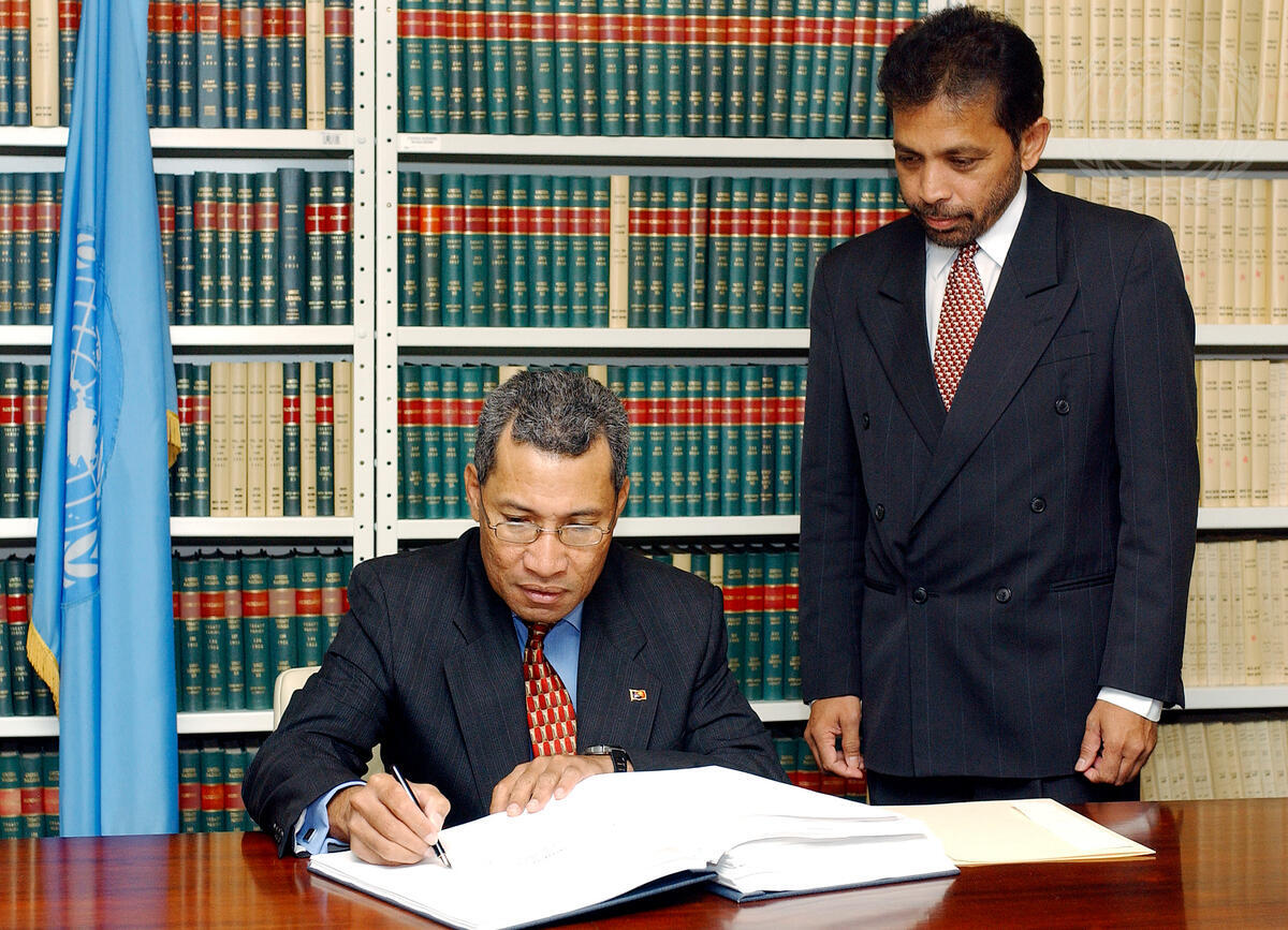 Robert Guba Aisi (left), Permanent Representative of Papua New Guinea to the United Nations, signs the "International Cocoa Agreement 2001".