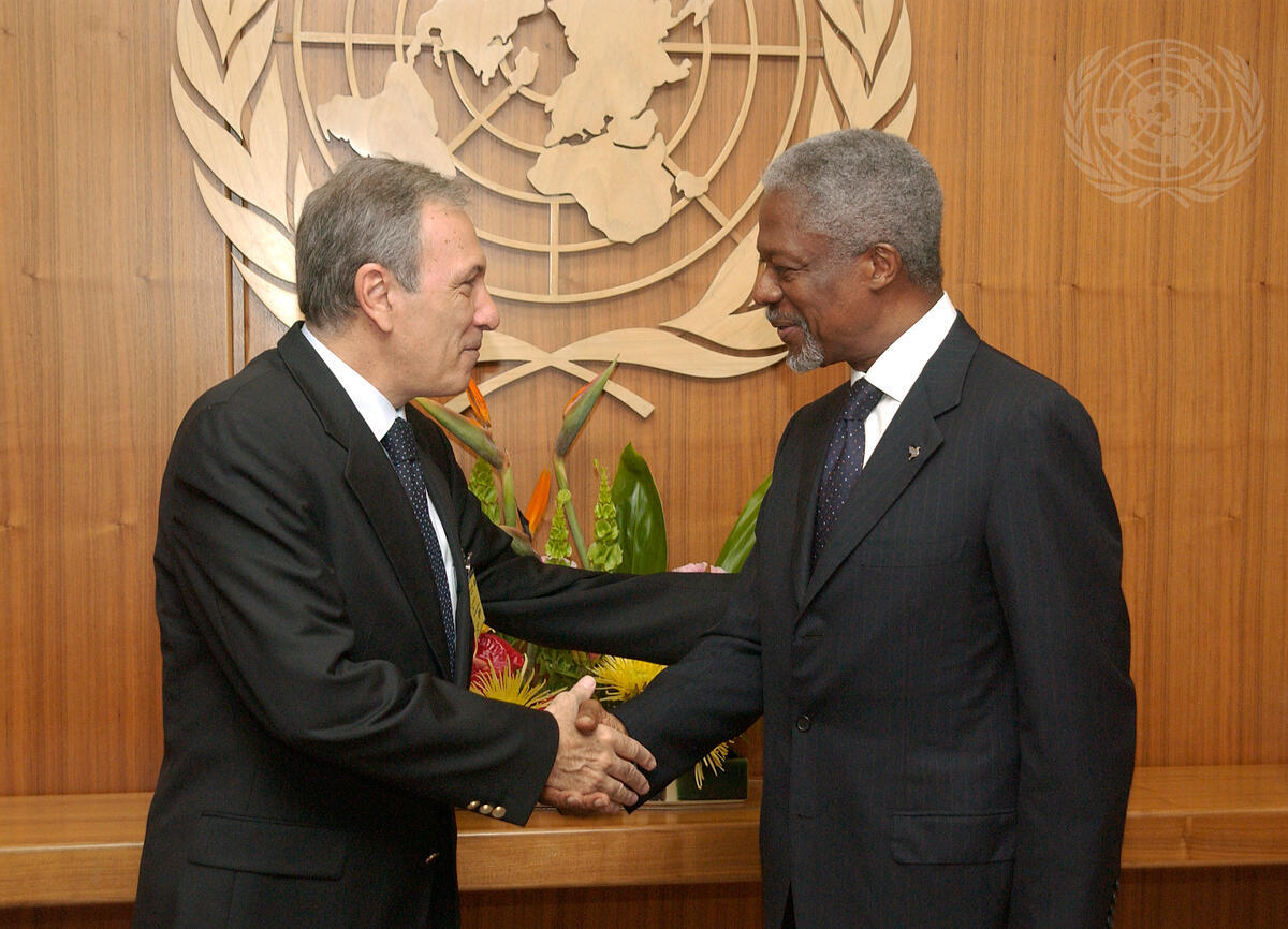 Secretary-General Kofi Annan (right) meets with Ismail Cem, former Minister for Foreign Affairs of Turkey.