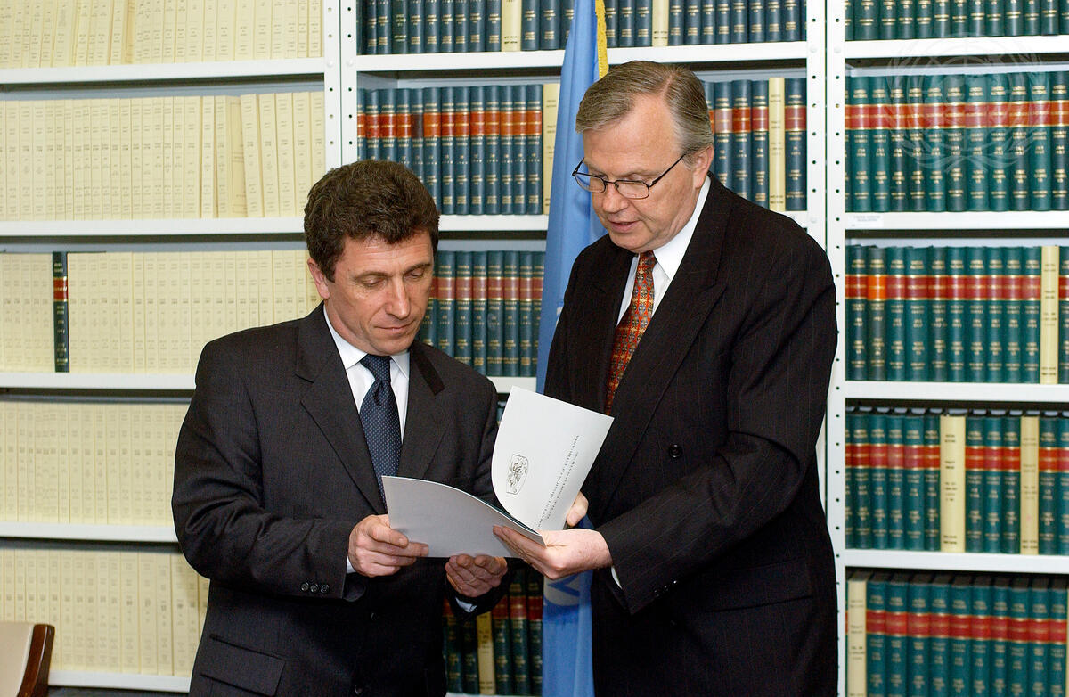 Antanas Valionis (right), Minister for Foreign Affairs of the Republic of Lithuania, signs and deposits the following instruments of ratification on behalf of his country: Statute of the International Criminal Court; Convention on the Prohibition of the Use, Stockpiling, Production and Transfer of Anti-Personnel Mines and on Their Destruction (1997); Protocol Against the Smuggling of Migrants by Land, Sea and Air, Supplementing the UN Convention Against Transnational Organized Crime; Amendment to Article I of the Convention on Prohibitions or Restrictions on The Use of Certain Conventional Weapons, Which May Be Deemed to be Excessively Injurious or to have Indiscriminate Effects.