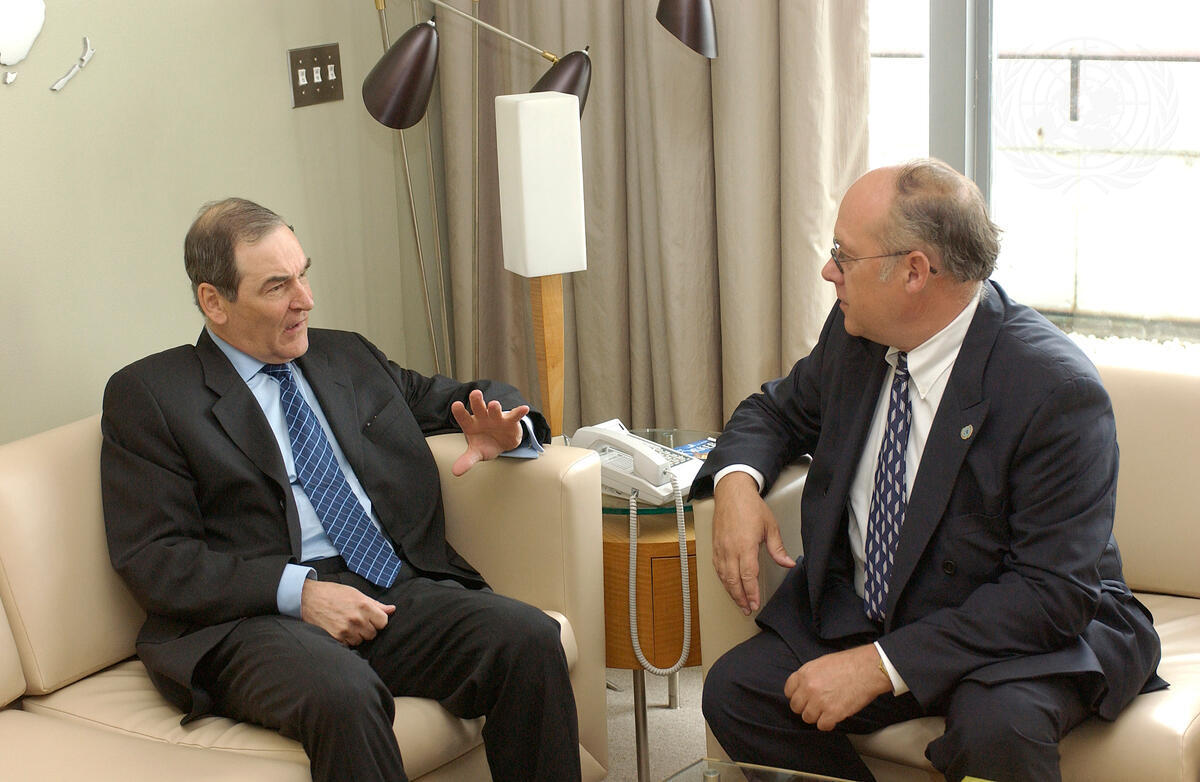 Jeremy Greenstock (left), Permanent Representative of the United Kingdom to the United Nations, meets with Jan Kavan, President of the fifty-seventh session of the General Assembly.