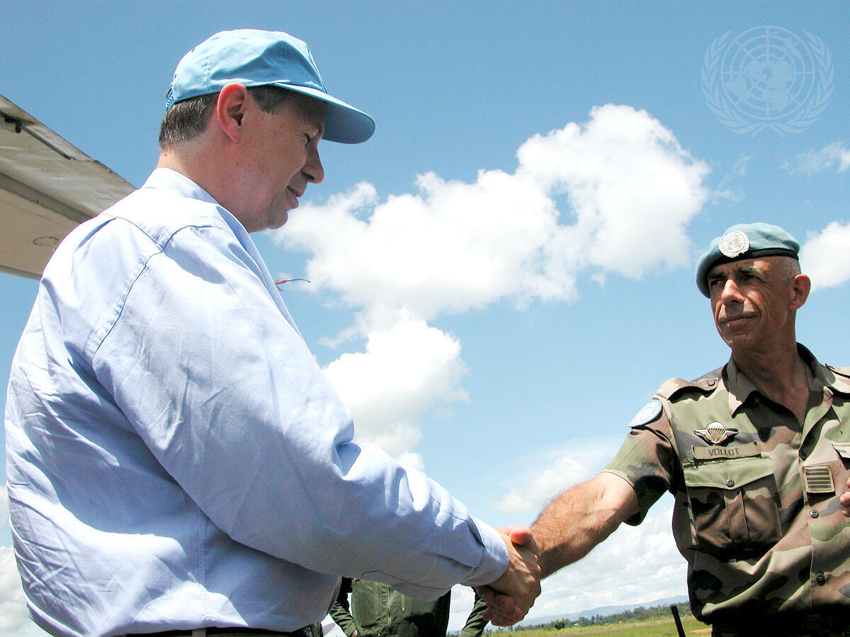 Jean-Marie Guehenno (left), Under-Secretary-General for Peacekeeping Operations, greets Colonel Vollot while in Bunia to assess the situation in the Democratic Republic of the Congo.