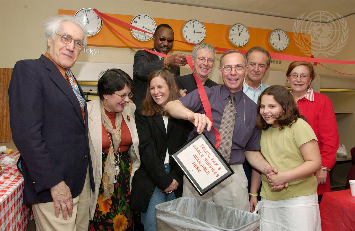 UN staff members and journalists gathered to toast the final day of the UN Cable Desk with the retirement of Anthony Pollina (with cable sign), who has served as its operator for the past 13 years while working for MCI WorldCom. An era of clacking Telex machines spewing forth streams of ticker-tape for UN accredited journalists officially came to a close that day, a victim of changing technology.
