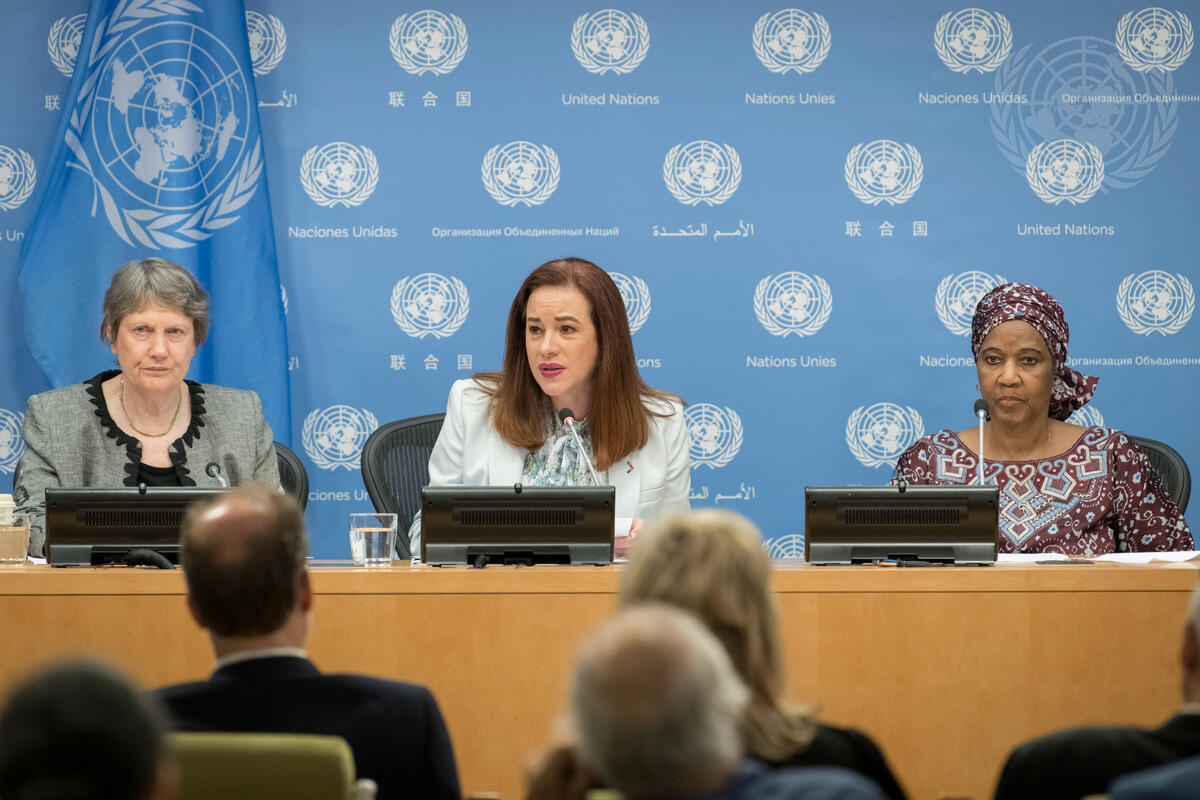 She is flanked by Helen Clark (left), former Prime Minister of New Zealand and former United Nations Development Programme (UNDP) Administrator, and Phumzile Mlambo-Ngcuka, Executive Director of UN Women.