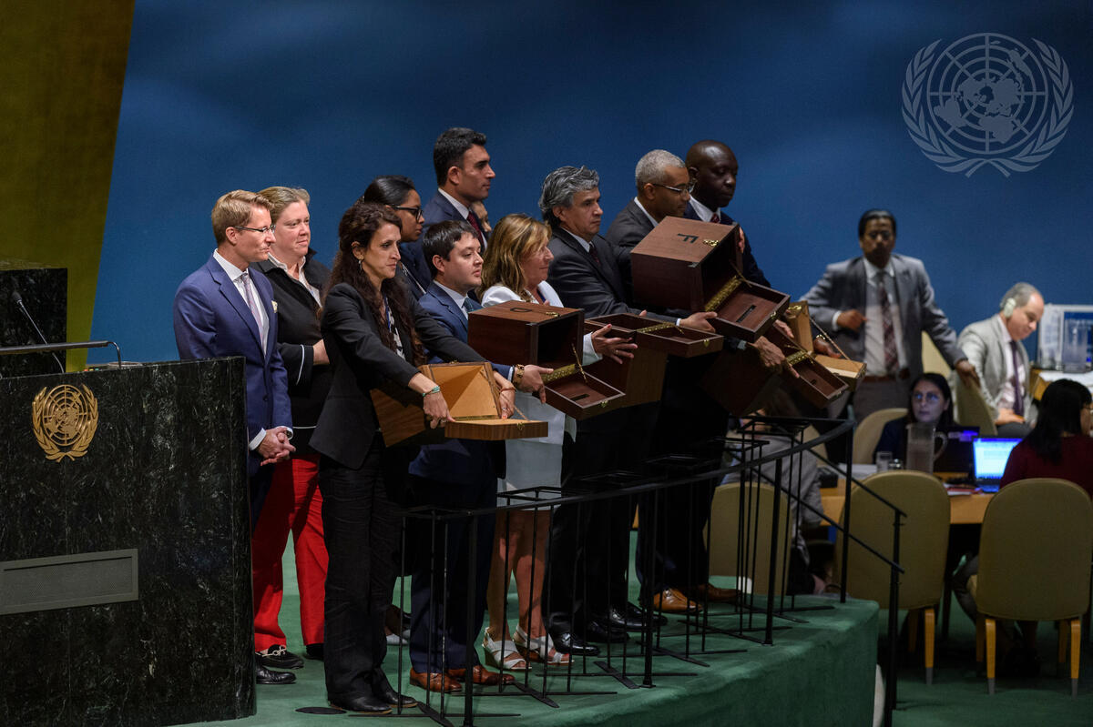 Conference officers show empty ballot boxes ahead of the election of judges to the United Nations Dispute Tribunal.