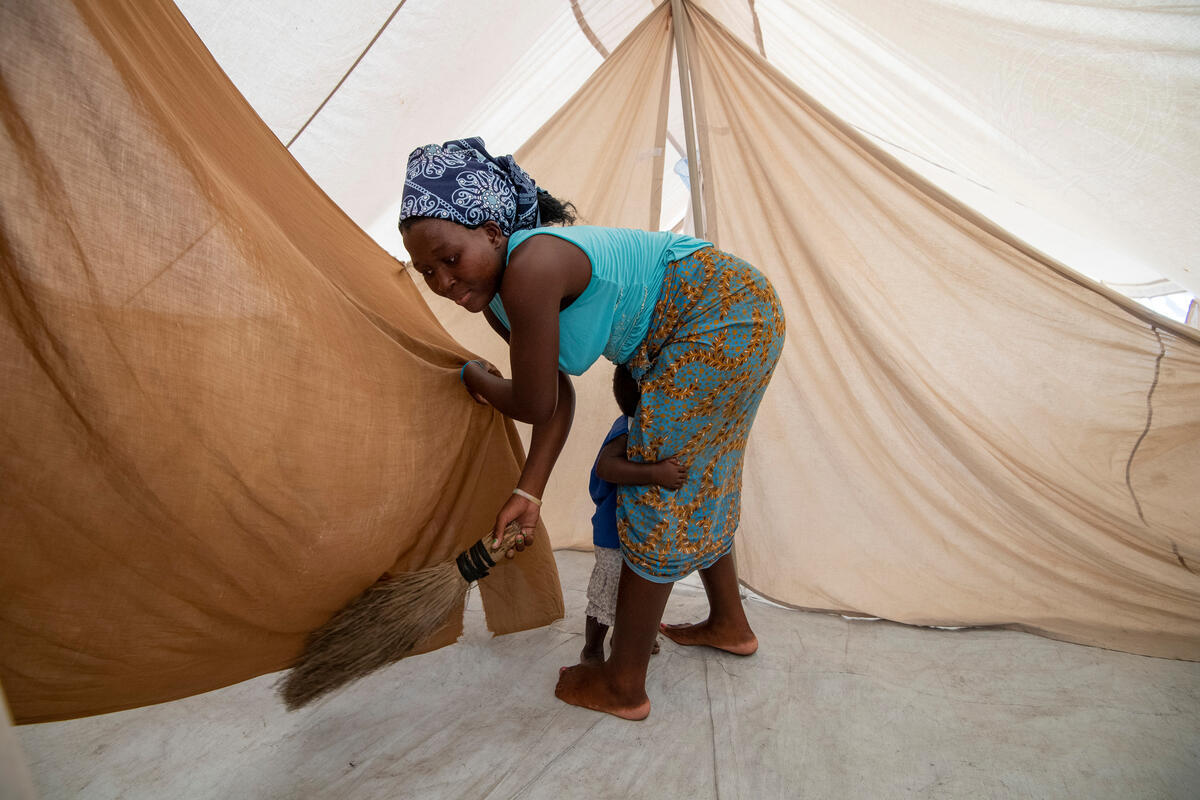 A woman sweeps her tent in the Mandruzi Resettlement site.