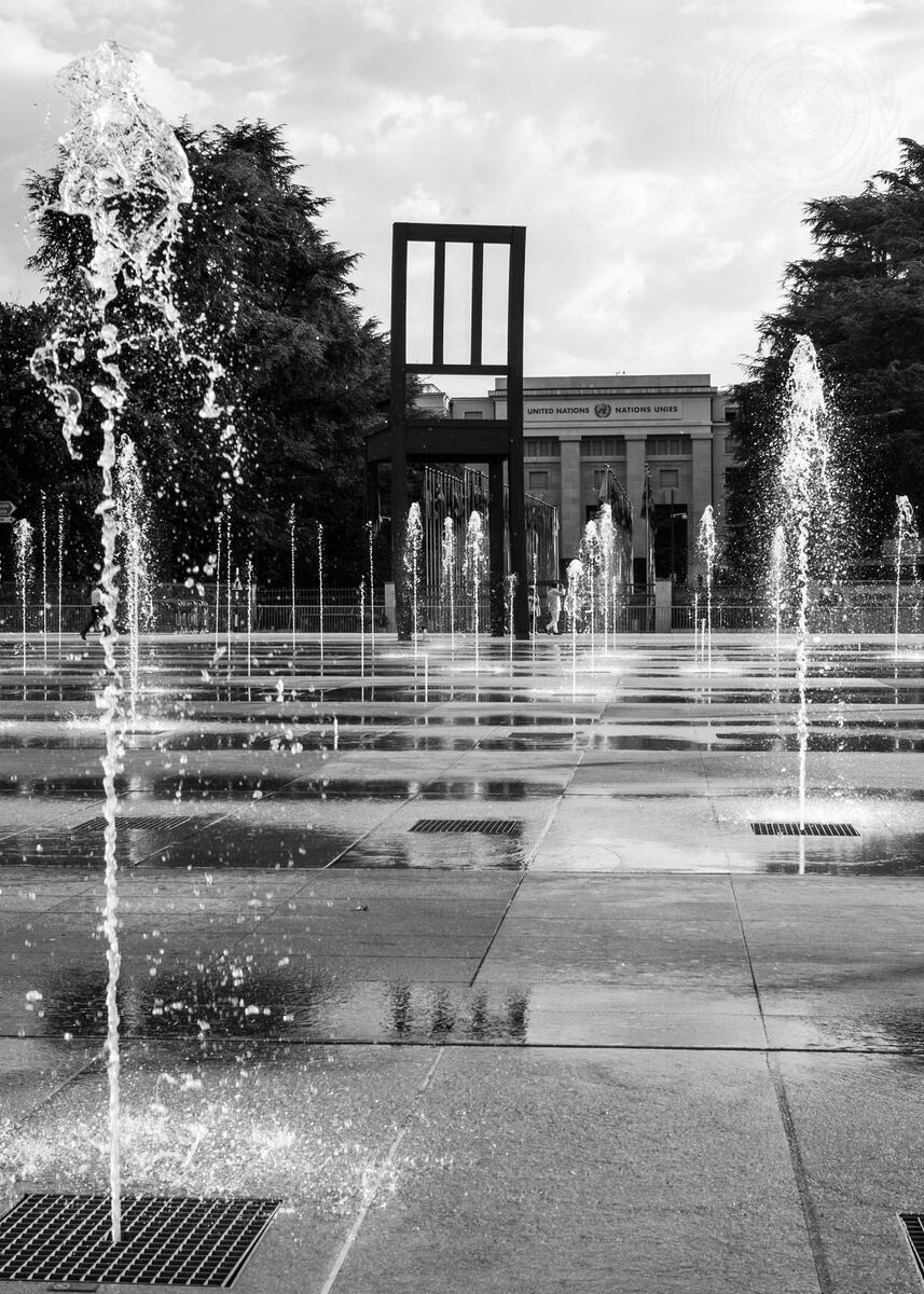 A view of the Palais des Nations with the ""Broken Chair"" monumental sculpture by the Swiss artist Daniel Berset, constructed by Louis Genève, in front.