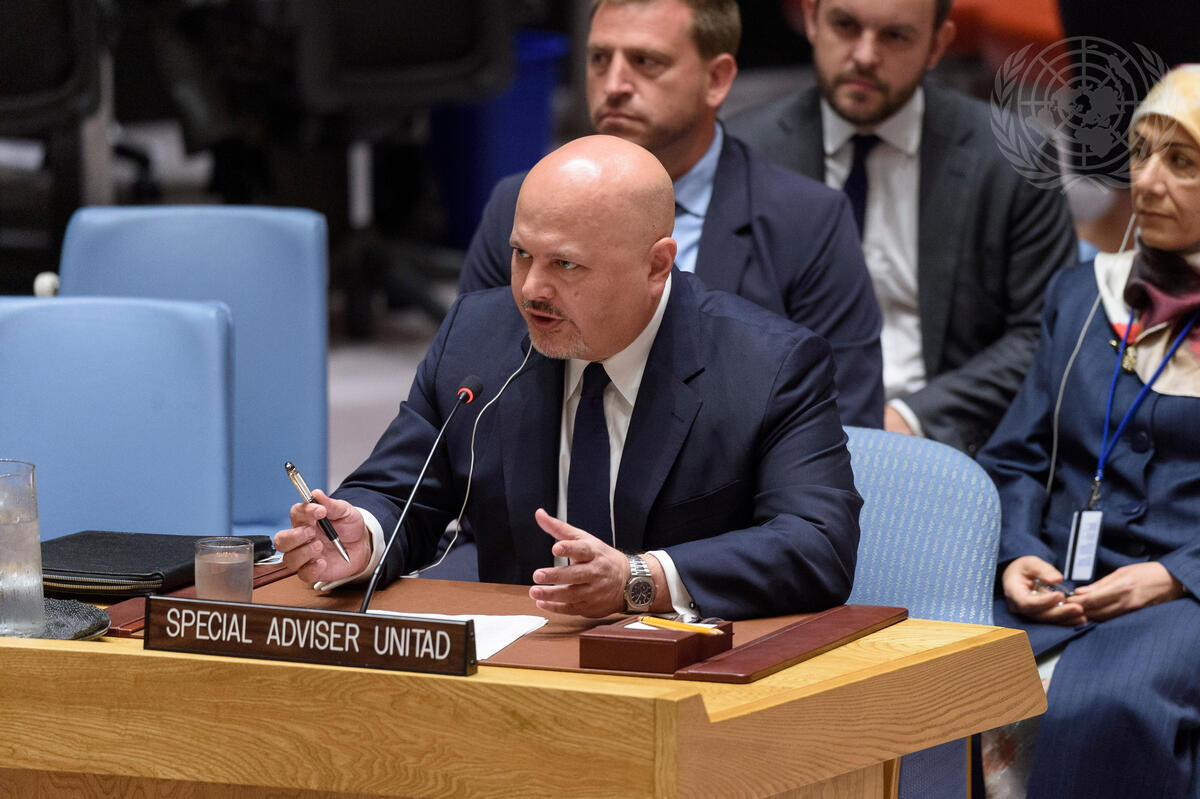 Karim Asad Ahmad Khan, Special Adviser and Head of the United Nations Investigative Team to Promote Accountability for Crimes Committed by Da’esh/Islamic State in Iraq and the Levant (UNITAD), briefs the Security Council meeting on threats to international peace and security.