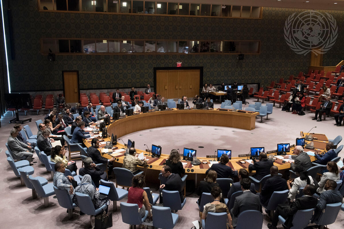 A wide view of the Security Council as Yury Fedotov (on screens), Executive Director of the United Nations Office on Drugs and Crime (UNODC), briefs the Council meeting on threats to international peace and security, with a focus on linkages between international terrorism and organized crime.