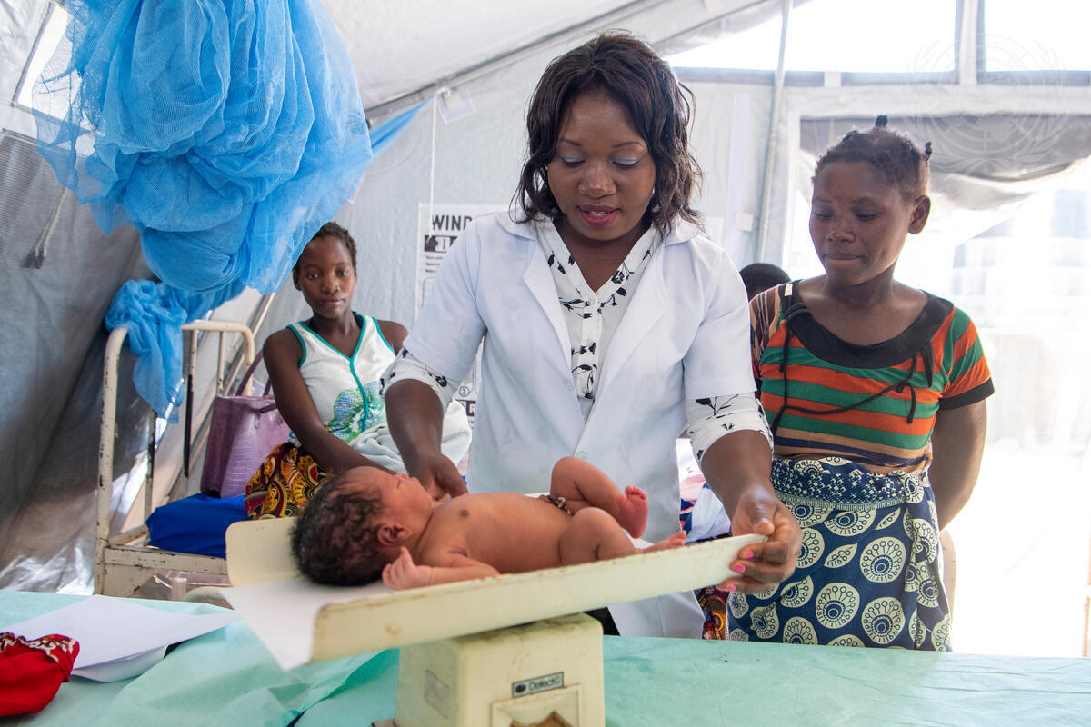 A medical practitioner examines a newborn baby at a clinic supported by the United Nations Population Fund (UNFPA) in the Mutua Camp in Mozambique.