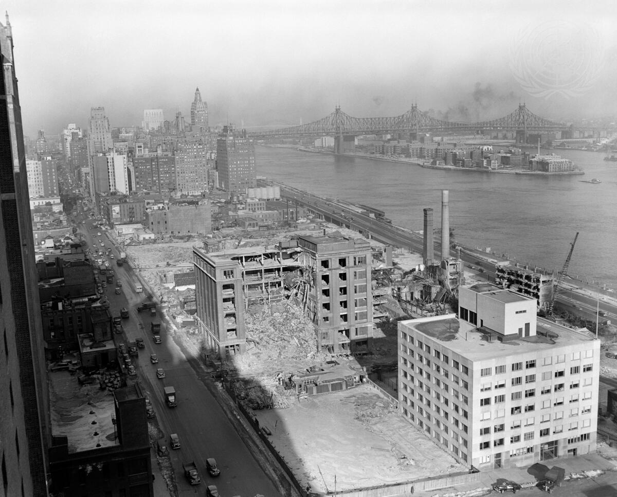 General view of the United Nations permanent headquarters site on Manhattan's East River, illustrating the present state of demolition. Newly erected seven-story structure in foreground which was designed for the New York City Housing Authority, was acquired recently by the United Nations. Known as Manhattan Building, it is already occupied by the first of the United Nations offices to be located on the permanent site.