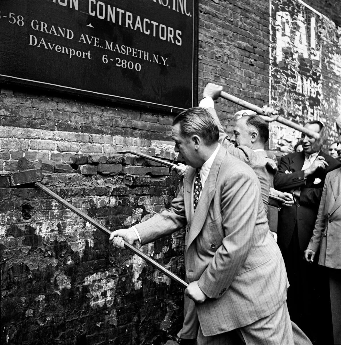 Hugo Rogers, left, Manhattan Borough President, and William O'Dwyer, Mayor of the City of New York, remove the first dozen bricks from a boarded-up tenement building during brief ceremony at which demolition of present structures on the U.N. Permanent Site was begun.